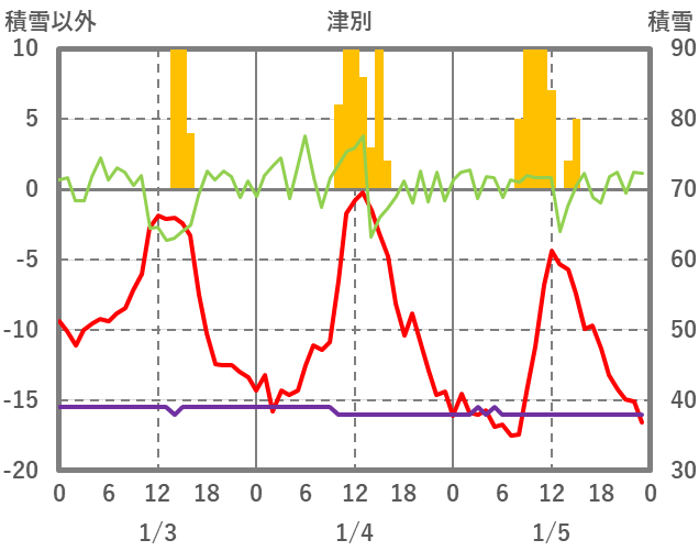 | 日 | 時 | 気温 | 降水 | 風向/風速 | 日照 | 積雪 | 降雪 |