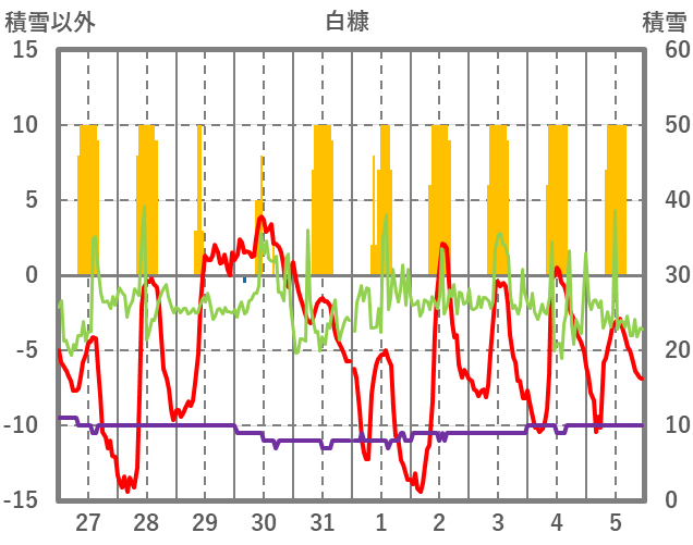 | 日 | 時 | 気温 | 降水 | 風向/風速 | 日照 | 積雪 | 降雪 |