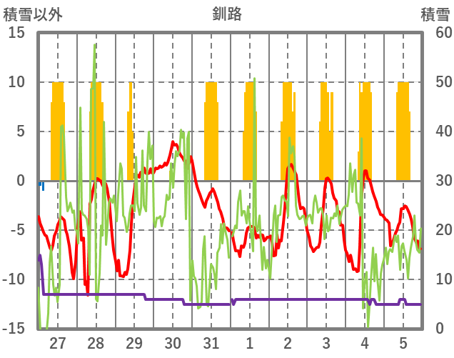 | 日 | 時 | 気温 | 降水 | 風向/風速 | 日照 | 積雪 | 降雪 |