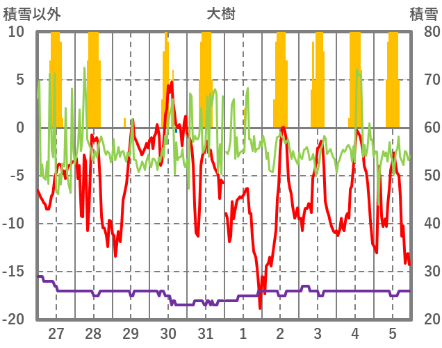 | 日 | 時 | 気温 | 降水 | 風向/風速 | 日照 | 積雪 | 降雪 |