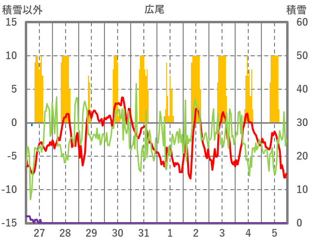 | 日 | 時 | 気温 | 降水 | 風向/風速 | 日照 | 積雪 | 降雪 |
