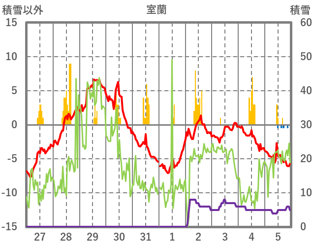 | 日 | 時 | 気温 | 降水 | 風向/風速 | 日照 | 積雪 | 降雪 |