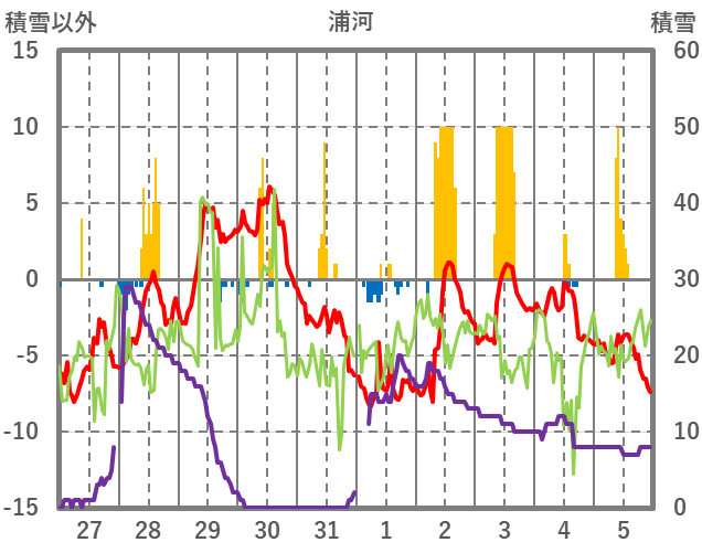 | 日 | 時 | 気温 | 降水 | 風向/風速 | 日照 | 積雪 | 降雪 |