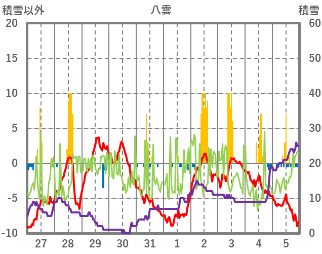 | 日 | 時 | 気温 | 降水 | 風向/風速 | 日照 | 積雪 | 降雪 |