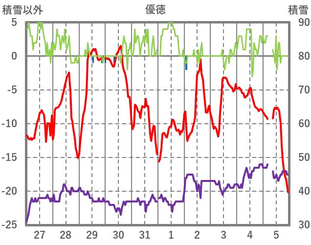| 日 | 時 | 気温 | 降水 | 風向/風速 | 日照 | 積雪 | 降雪 |