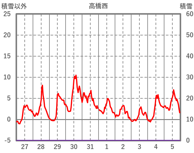 | 日 | 時 | 気温 | 降水 | 風向/風速 | 日照 | 積雪 | 降雪 |
