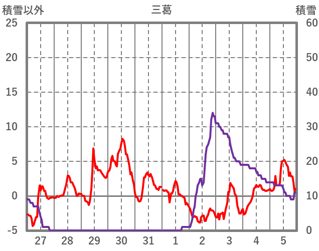 | 日 | 時 | 気温 | 降水 | 風向/風速 | 日照 | 積雪 | 降雪 |