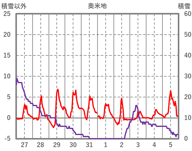 | 日 | 時 | 気温 | 降水 | 風向/風速 | 日照 | 積雪 | 降雪 |