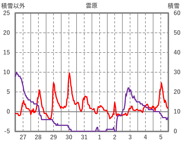 | 日 | 時 | 気温 | 降水 | 風向/風速 | 日照 | 積雪 | 降雪 |