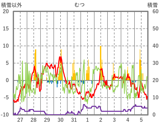 | 日 | 時 | 気温 | 降水 | 風向/風速 | 日照 | 積雪 | 降雪 |