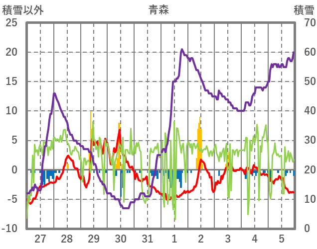 | 日 | 時 | 気温 | 降水 | 風向/風速 | 日照 | 積雪 | 降雪 |