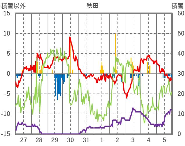 | 日 | 時 | 気温 | 降水 | 風向/風速 | 日照 | 積雪 | 降雪 |