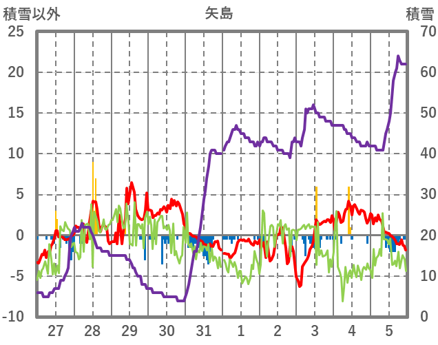 | 日 | 時 | 気温 | 降水 | 風向/風速 | 日照 | 積雪 | 降雪 |