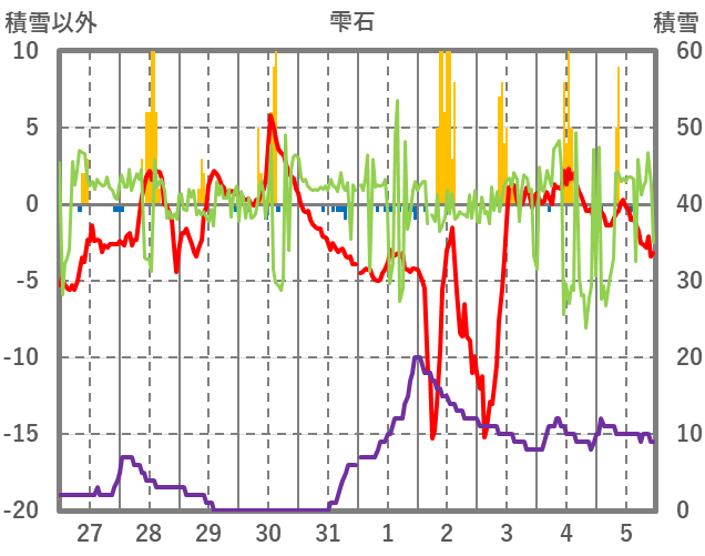 | 日 | 時 | 気温 | 降水 | 風向/風速 | 日照 | 積雪 | 降雪 |