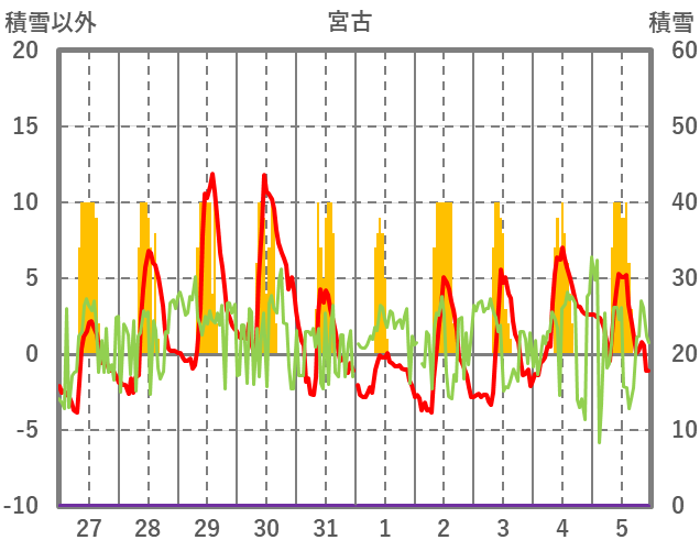 | 日 | 時 | 気温 | 降水 | 風向/風速 | 日照 | 積雪 | 降雪 |