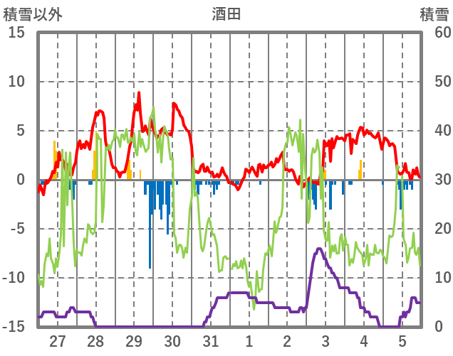 | 日 | 時 | 気温 | 降水 | 風向/風速 | 日照 | 積雪 | 降雪 |