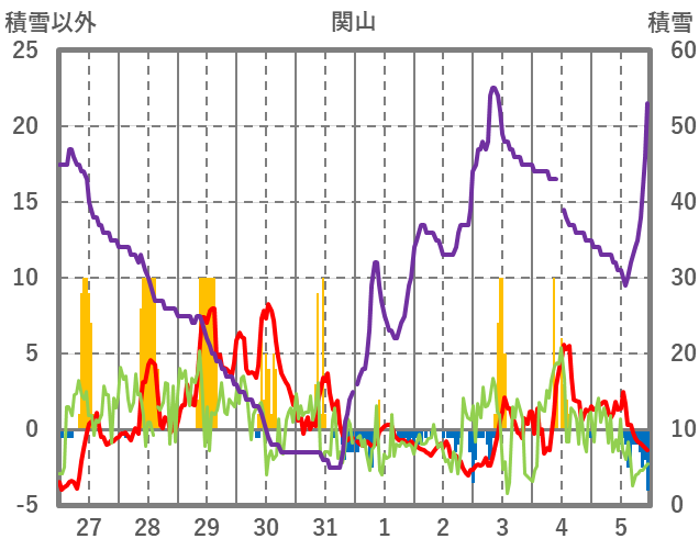 | 日 | 時 | 気温 | 降水 | 風向/風速 | 日照 | 積雪 | 降雪 |
