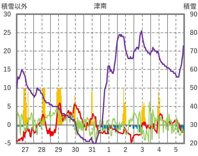 | 日 | 時 | 気温 | 降水 | 風向/風速 | 日照 | 積雪 | 降雪 |