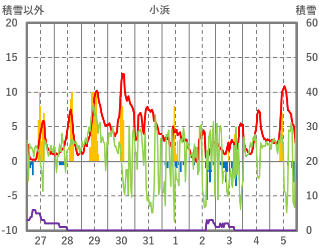 | 日 | 時 | 気温 | 降水 | 風向/風速 | 日照 | 積雪 | 降雪 |