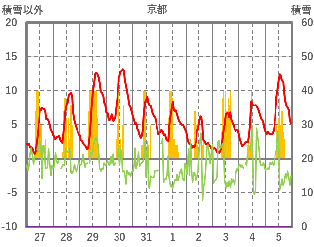 | 日 | 時 | 気温 | 降水 | 風向/風速 | 日照 | 積雪 | 降雪 |