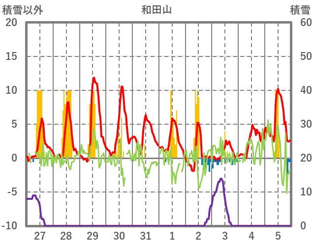 | 日 | 時 | 気温 | 降水 | 風向/風速 | 日照 | 積雪 | 降雪 |