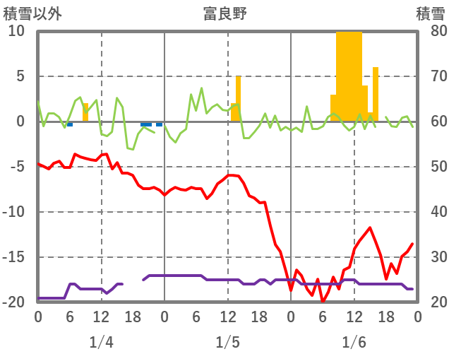 | 日 | 時 | 気温 | 降水 | 風向/風速 | 日照 | 積雪 | 降雪 |