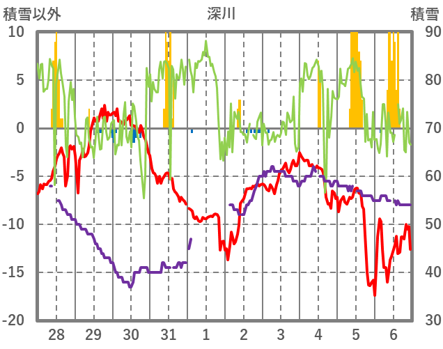 | 日 | 時 | 気温 | 降水 | 風向/風速 | 日照 | 積雪 | 降雪 |