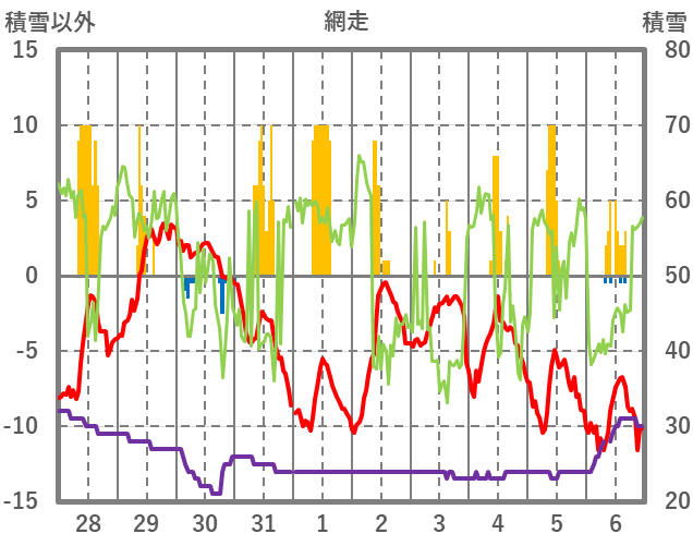 | 日 | 時 | 気温 | 降水 | 風向/風速 | 日照 | 積雪 | 降雪 |