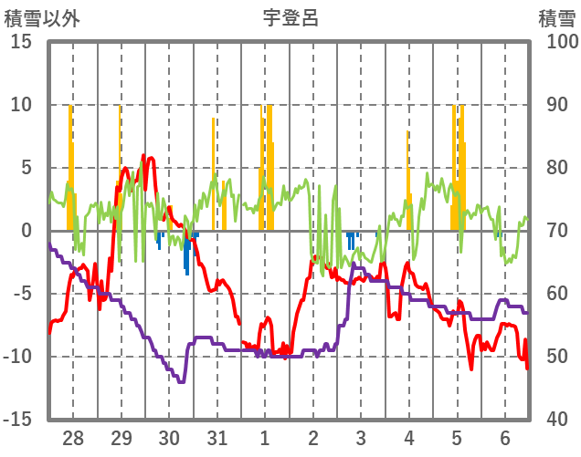 | 日 | 時 | 気温 | 降水 | 風向/風速 | 日照 | 積雪 | 降雪 |