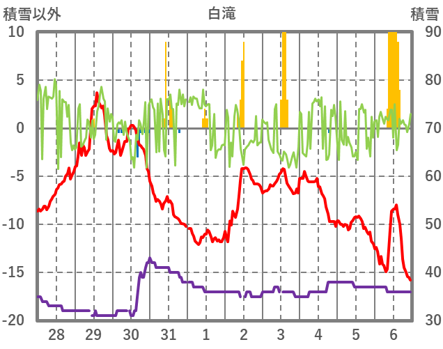 | 日 | 時 | 気温 | 降水 | 風向/風速 | 日照 | 積雪 | 降雪 |