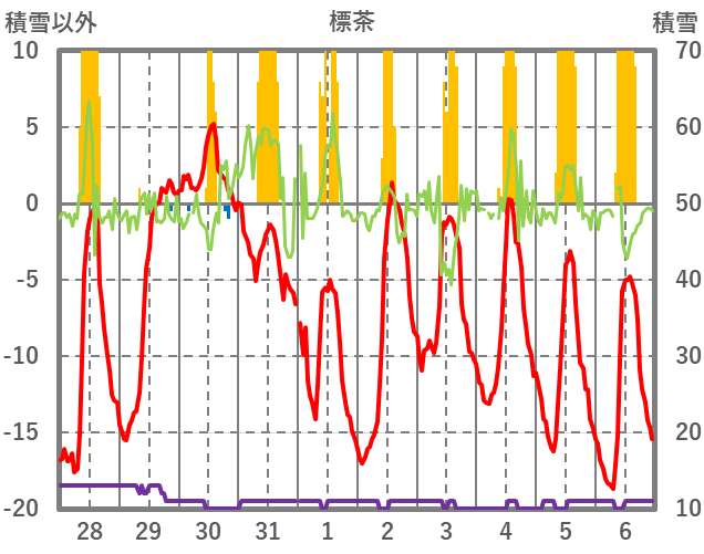 | 日 | 時 | 気温 | 降水 | 風向/風速 | 日照 | 積雪 | 降雪 |