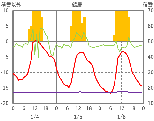 | 日 | 時 | 気温 | 降水 | 風向/風速 | 日照 | 積雪 | 降雪 |