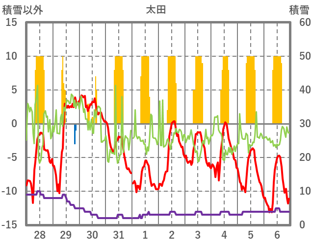 | 日 | 時 | 気温 | 降水 | 風向/風速 | 日照 | 積雪 | 降雪 |