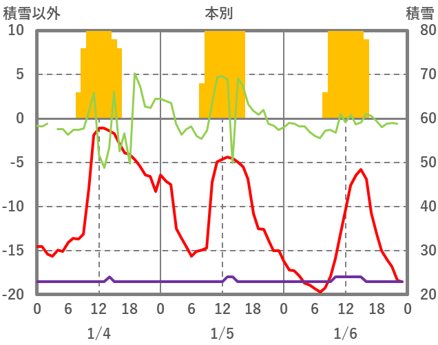 | 日 | 時 | 気温 | 降水 | 風向/風速 | 日照 | 積雪 | 降雪 |