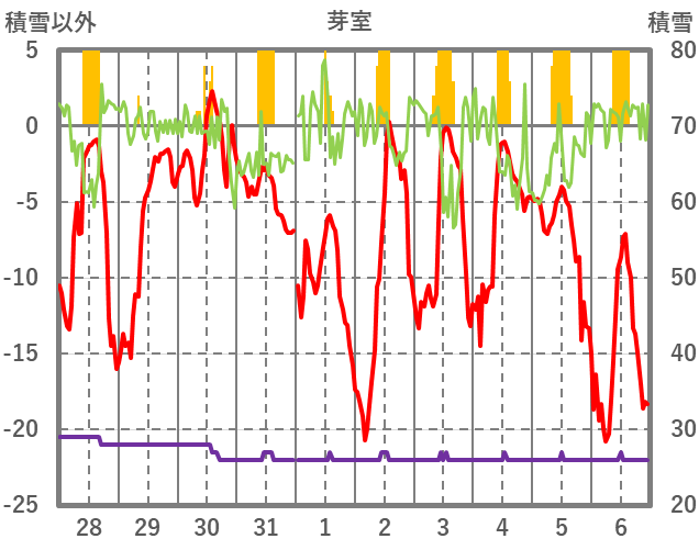 | 日 | 時 | 気温 | 降水 | 風向/風速 | 日照 | 積雪 | 降雪 |