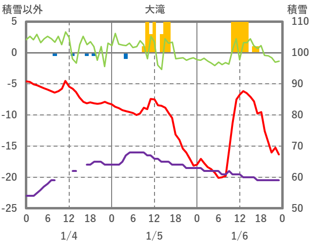 | 日 | 時 | 気温 | 降水 | 風向/風速 | 日照 | 積雪 | 降雪 |
