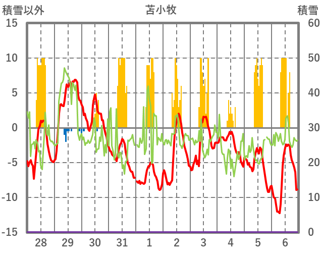 | 日 | 時 | 気温 | 降水 | 風向/風速 | 日照 | 積雪 | 降雪 |