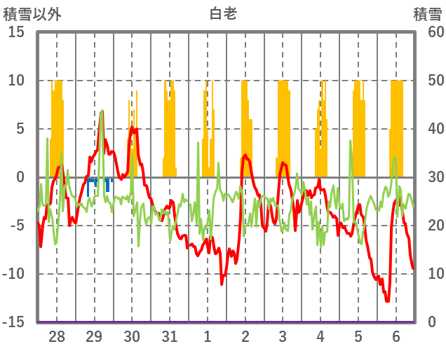 | 日 | 時 | 気温 | 降水 | 風向/風速 | 日照 | 積雪 | 降雪 |