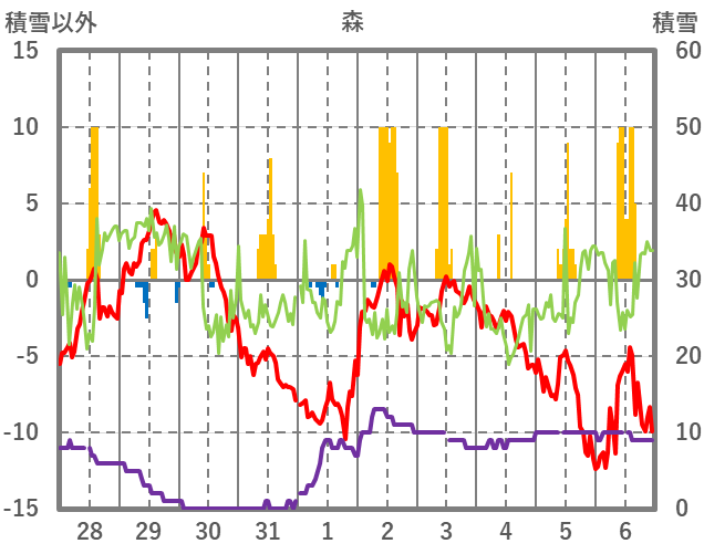| 日 | 時 | 気温 | 降水 | 風向/風速 | 日照 | 積雪 | 降雪 |