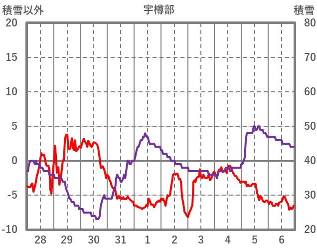 | 日 | 時 | 気温 | 降水 | 風向/風速 | 日照 | 積雪 | 降雪 |