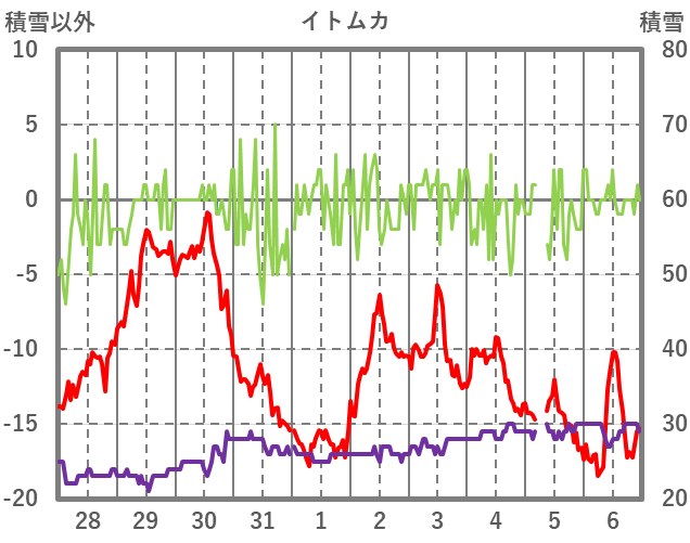 | 日 | 時 | 気温 | 降水 | 風向/風速 | 日照 | 積雪 | 降雪 |