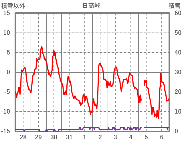 | 日 | 時 | 気温 | 降水 | 風向/風速 | 日照 | 積雪 | 降雪 |