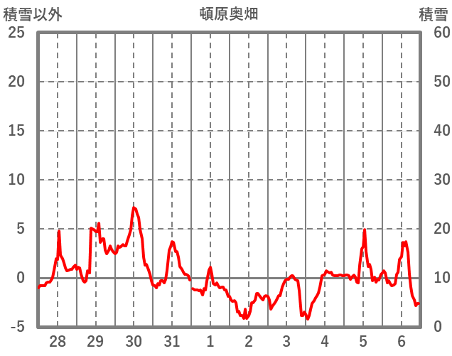 | 日 | 時 | 気温 | 降水 | 風向/風速 | 日照 | 積雪 | 降雪 |