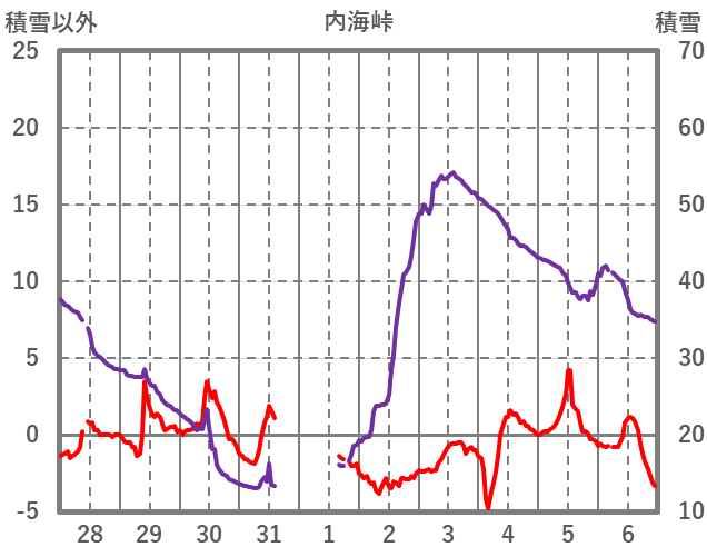 | 日 | 時 | 気温 | 降水 | 風向/風速 | 日照 | 積雪 | 降雪 |