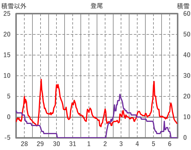| 日 | 時 | 気温 | 降水 | 風向/風速 | 日照 | 積雪 | 降雪 |