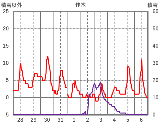 | 日 | 時 | 気温 | 降水 | 風向/風速 | 日照 | 積雪 | 降雪 |
