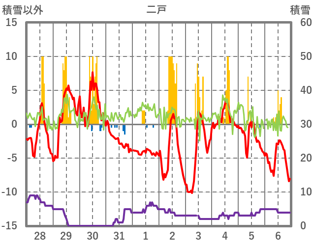 | 日 | 時 | 気温 | 降水 | 風向/風速 | 日照 | 積雪 | 降雪 |