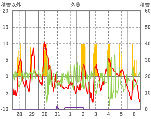 | 日 | 時 | 気温 | 降水 | 風向/風速 | 日照 | 積雪 | 降雪 |