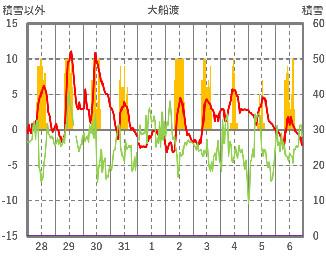 | 日 | 時 | 気温 | 降水 | 風向/風速 | 日照 | 積雪 | 降雪 |
