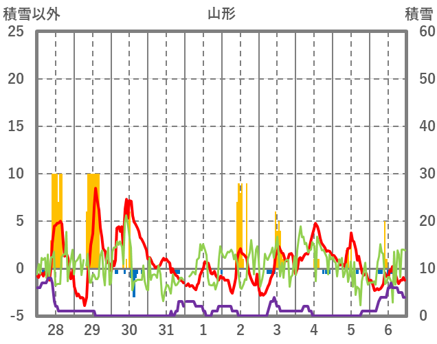 | 日 | 時 | 気温 | 降水 | 風向/風速 | 日照 | 積雪 | 降雪 |
